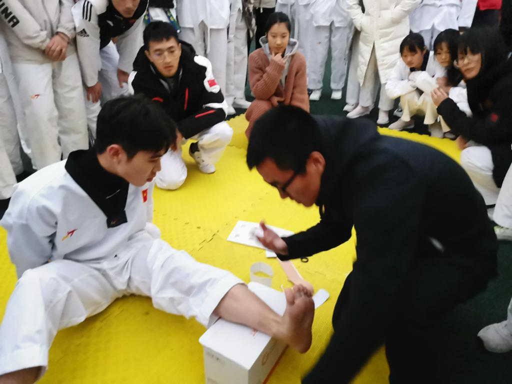 的跆拳道发展工作做出肯定。刘印女士就学生练习情况做出相关指导,尔后宋衍先生就体育锻炼康复方面向同学们普及相关知识,讲解急救技巧以及操作方法。