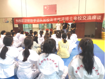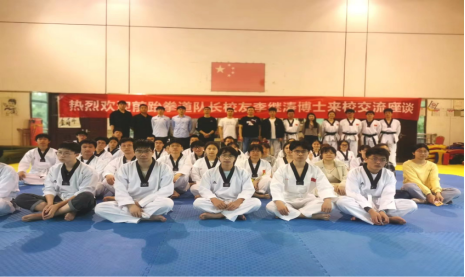 跆拳道校队联合第二课堂举办了一场以优秀校友分享学习心得的座谈会。此次座谈会邀请了优秀校友代表兼前跆拳道队长李继涛博士和学生们交流学习心得,旨在让学生们树立正确的人生目标。