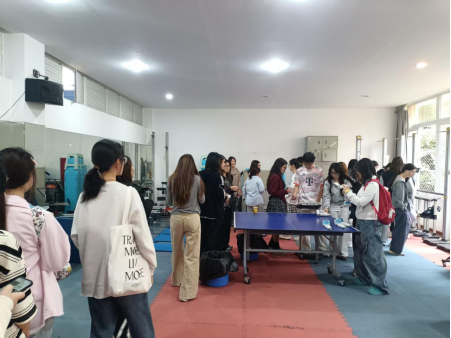 (图3:龙泉校区室内测试现场——学生在工作人员引导下进行肺活量测试)