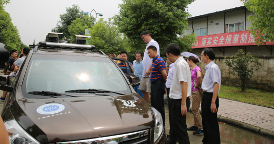 控制工程学院蒋涛副院长为姚明先生边讲解边演示最新的科研成果“无人驾驶汽车”项目。