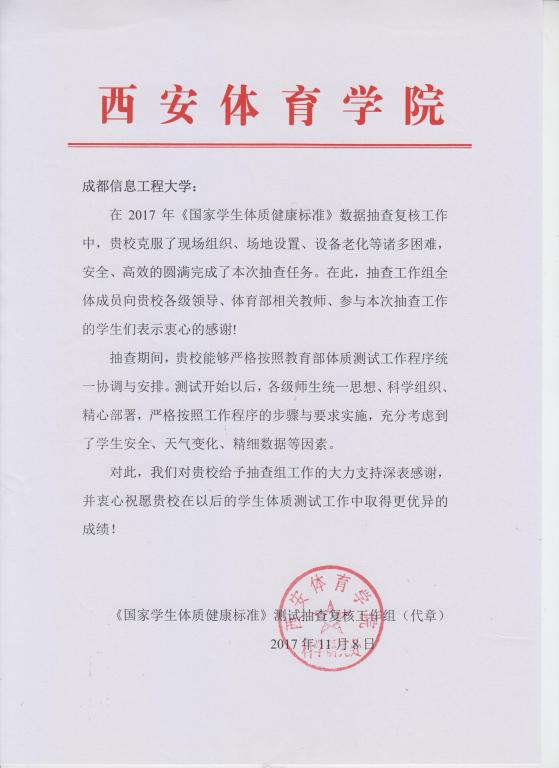 教育部体质测试抽检工作组对易直播 发来感谢信