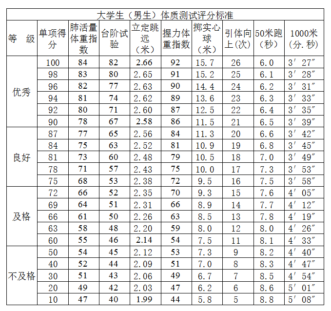 大学生(男生)体质测试评分标准